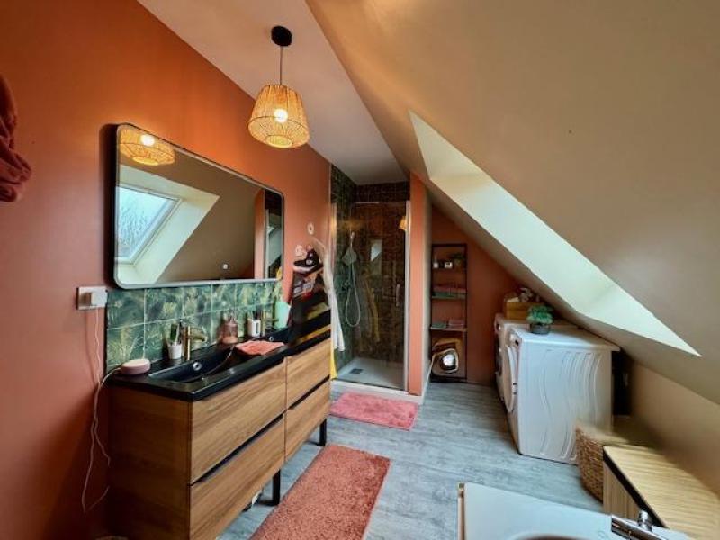 Pavillon indiv en semi-plain pied de 145 m² hab, édifié en 2022 sur et avec 1678m² de terrain arboré, proposé à la vente au prix de 328000.00 € FAI pour lequel une visite s'impose! Vous découvrirez un vestibule d'accueil élégant avec son plafond cathédrale, une vaste pièce de vie lumineuse de 52 m² vue jardin, complétée par une cuisine équipée avec espace snack. Une suite parentale, chambre avec salle de bain et douche à l'italienne attenante est l'atout majeur de ce niveau. Côté pratique, une buanderie-chaufferie avec accès sur la terrasse de votre futur garage . A l'étage, un palier mezzanine pouvant servir d'espace bureau distribue trois chambres( dont une actuellement à usage de dressing) , une salle de bain, baignoire et douche et un wc indépendant. L'ensemble est chauffé au gaz par une dalle chauffante au rdc et des radiateurs pour l'étage. L'avis du Pro : Ce bien, toujours sous garantie décennale, allie le charme de la campagne, modernité, confort, convivialité et la proximité des villes de Valenciennes (20 mns) et Cambrai (25mns).Il vous offre un cadre de vie serein et verdoyant.